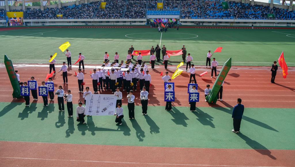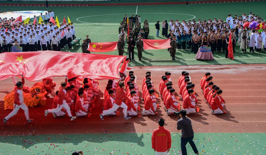 入场式结束后,现场举行庄严的升国旗仪式。全体师生肃立注目,高唱国歌,鲜艳的五星红旗在体育中心上空冉冉升起。